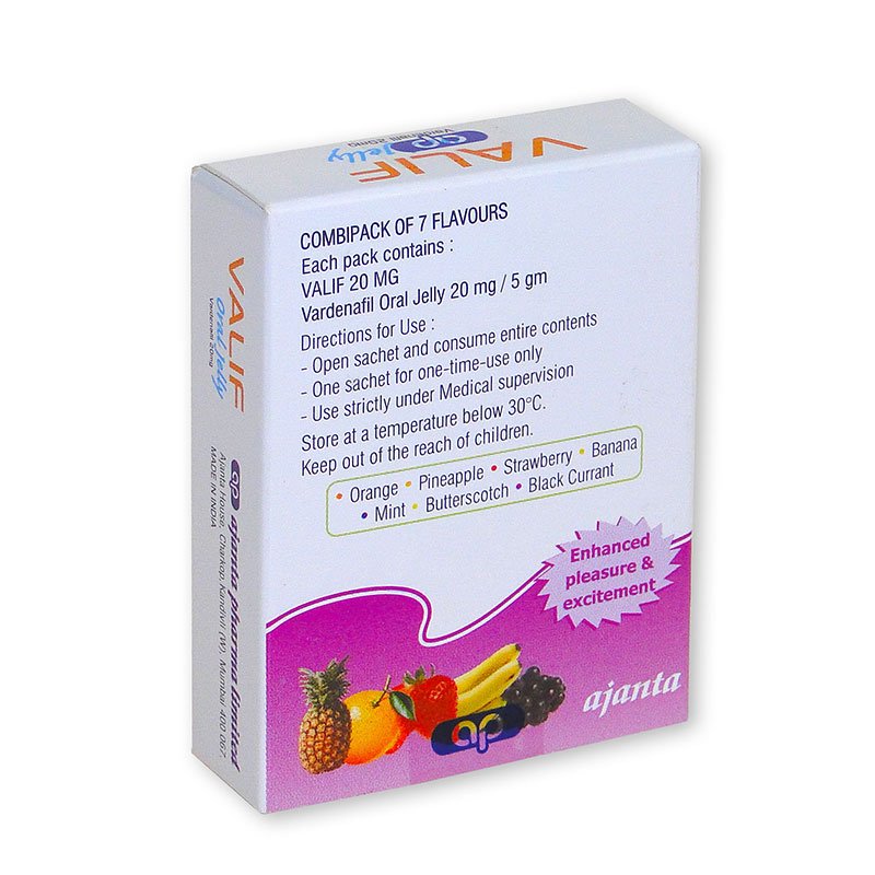 Valif Oral Jelly 20mg es un poderoso estimulante usado para la impotencia (disfunción eréctil) y es tan efectivo como fácil de usar. Este producto está integrado por 7 sobres con 5 ml de producto y cada uno con sabor frutal diferente.